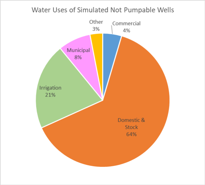 - Pie chart shows reported water uses of wells simulated to be not pumpable after 100 years